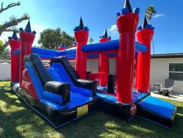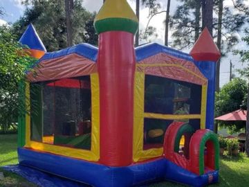 The 5-Part Multi-Play Rainbow Inflatable Bounce House and Slide Combo has all the fun of a traditional bounce house, combined with fun obstacles to jump or crawl through, a basketball hoop and a slide, all packed within the same inflatable bounce house